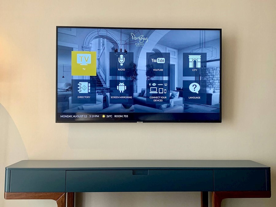 O hotel dispõe de um canal interno e TV com mais de 60 canais internacionais.
